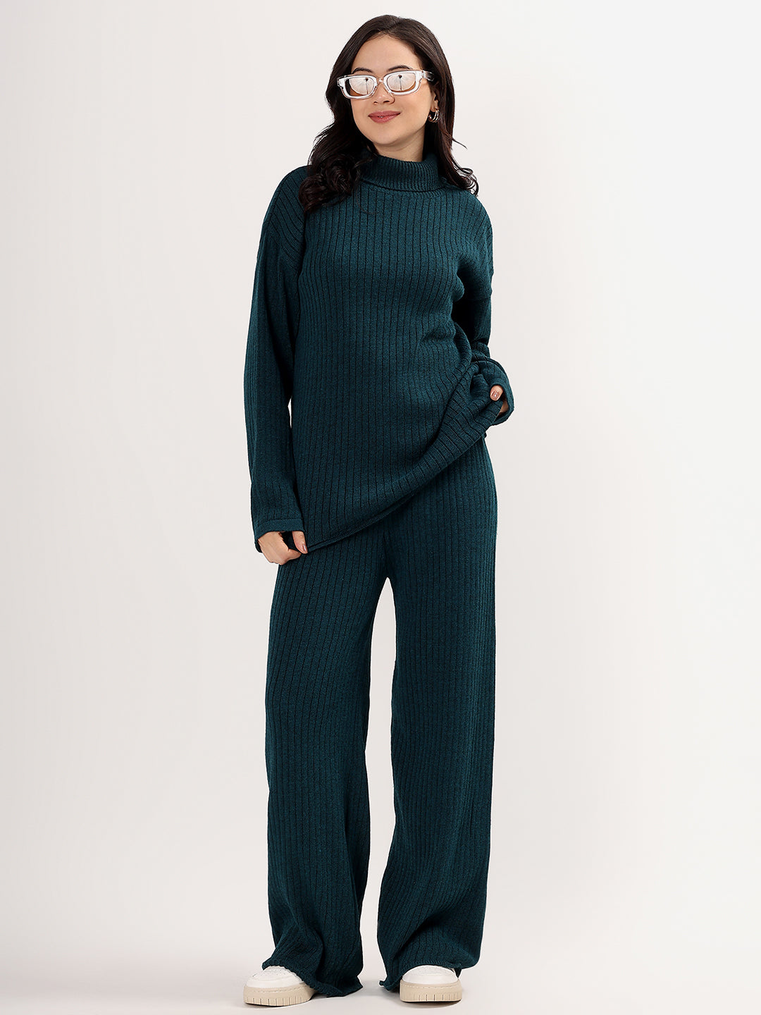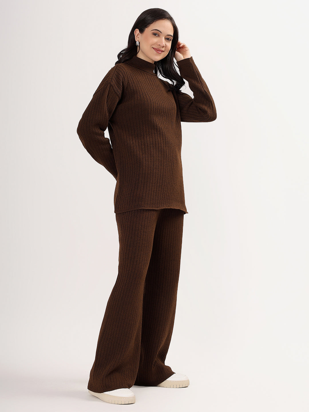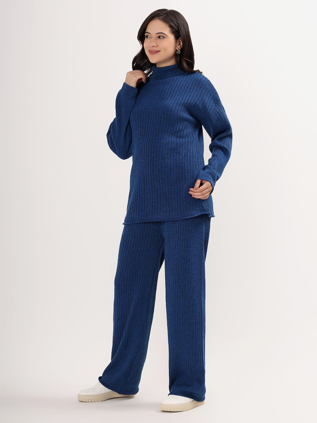 Elevate your winter wardrobe with the Kvetoo Women Woollen Co-ord Set, a perfect blend of style, warmth, and comfort. This elegant two-piece set features a high neck ribbed knit sweater paired with matching wide leg ribbed knit pants, offering a modern silhouette with cozy appeal. Crafted from a soft wool blend, this set is ideal for casual outings, lounge wear, or even work-from-home chic.