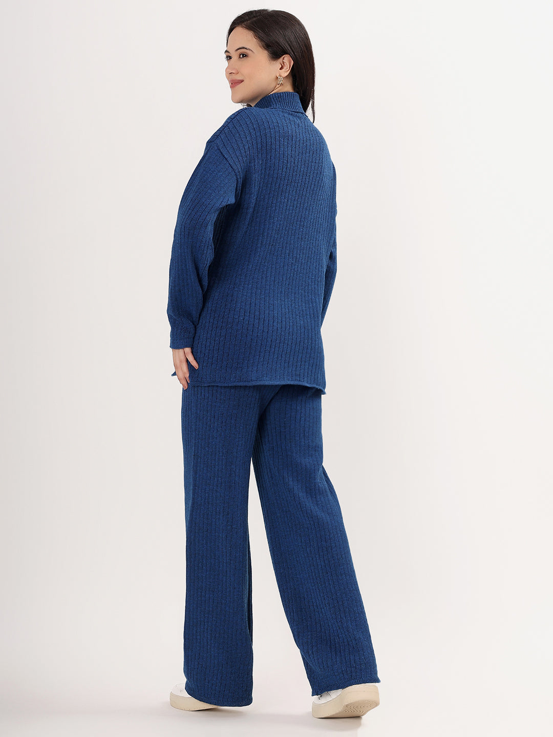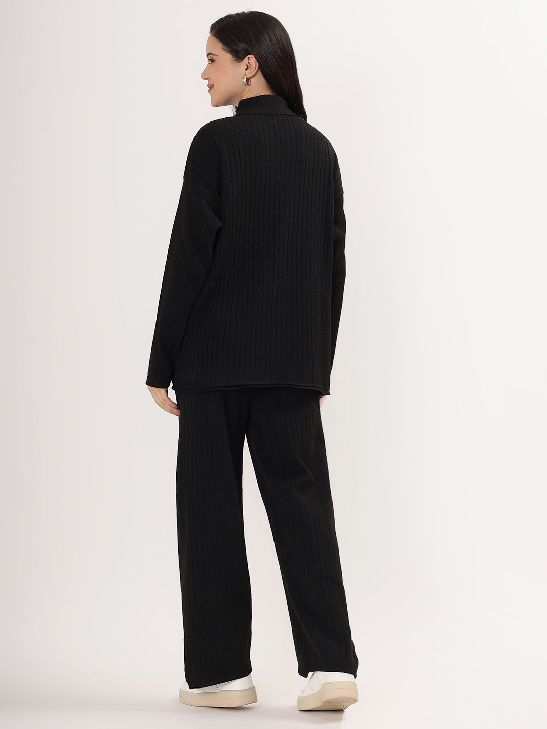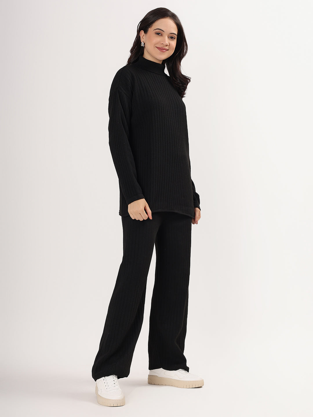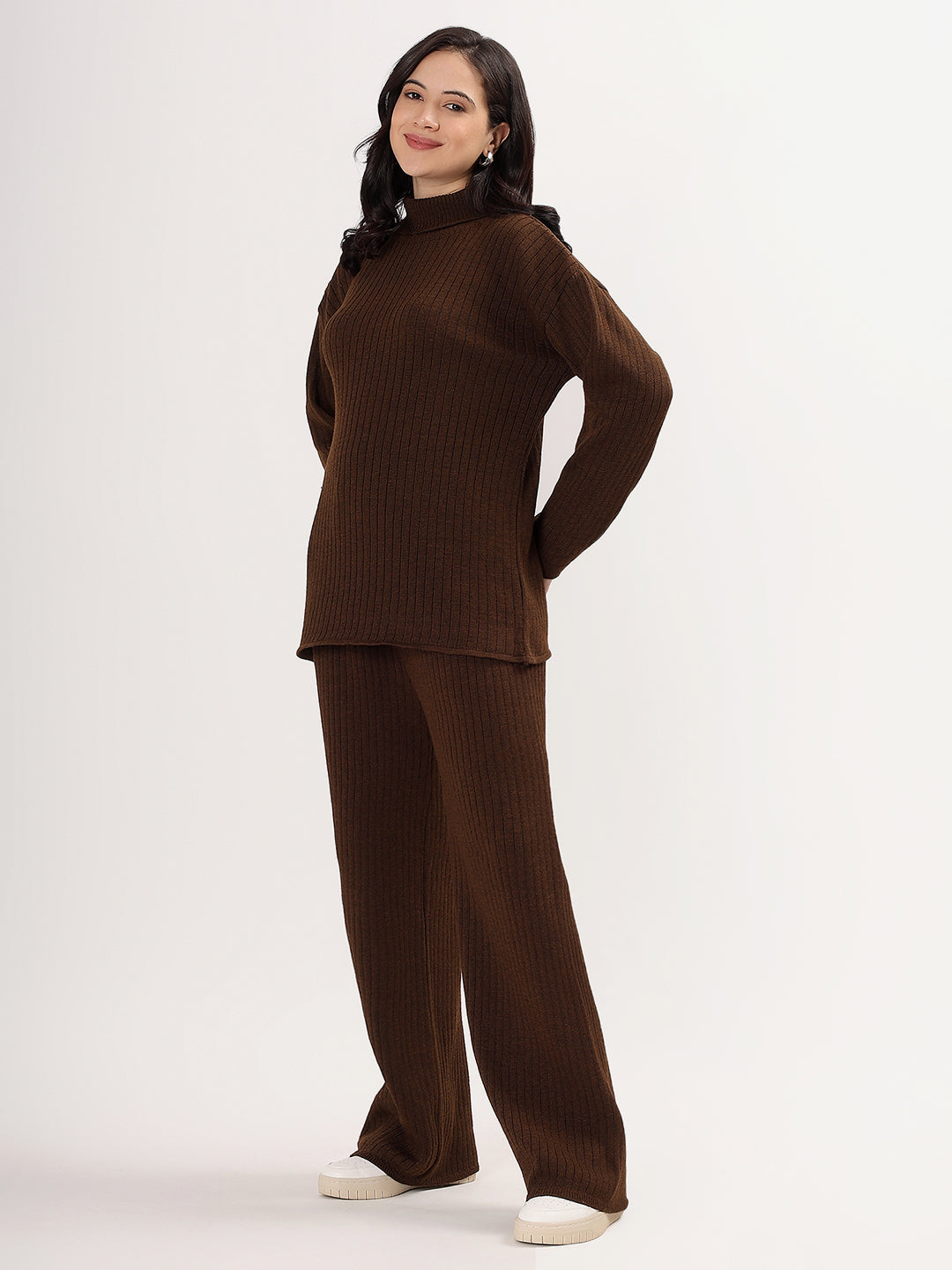 Elevate your winter wardrobe with the Kvetoo Women Woollen Co-ord Set, a perfect blend of style, warmth, and comfort. This elegant two-piece set features a high neck ribbed knit sweater paired with matching wide leg ribbed knit pants, offering a modern silhouette with cozy appeal. Crafted from a soft wool blend, this set is ideal for casual outings, lounge wear, or even work-from-home chic.