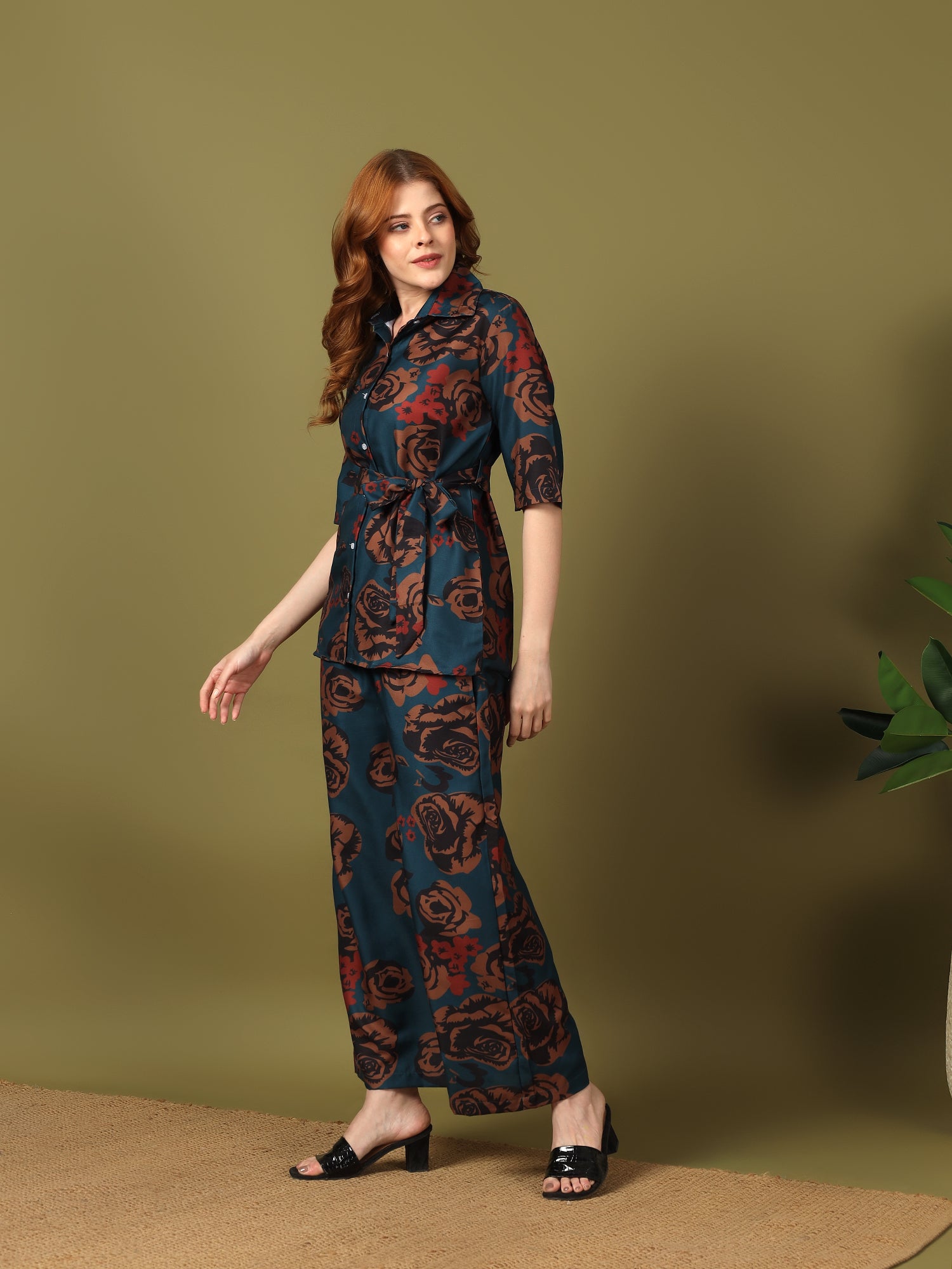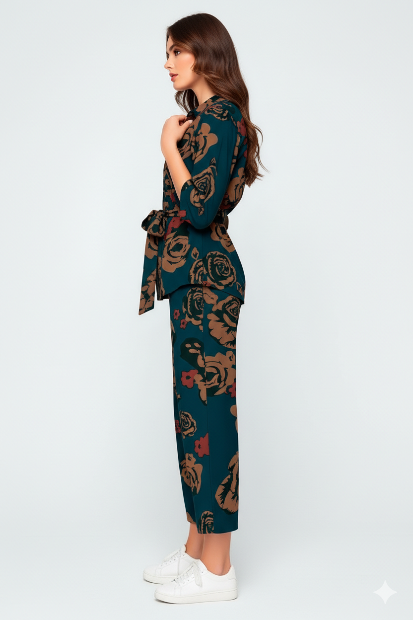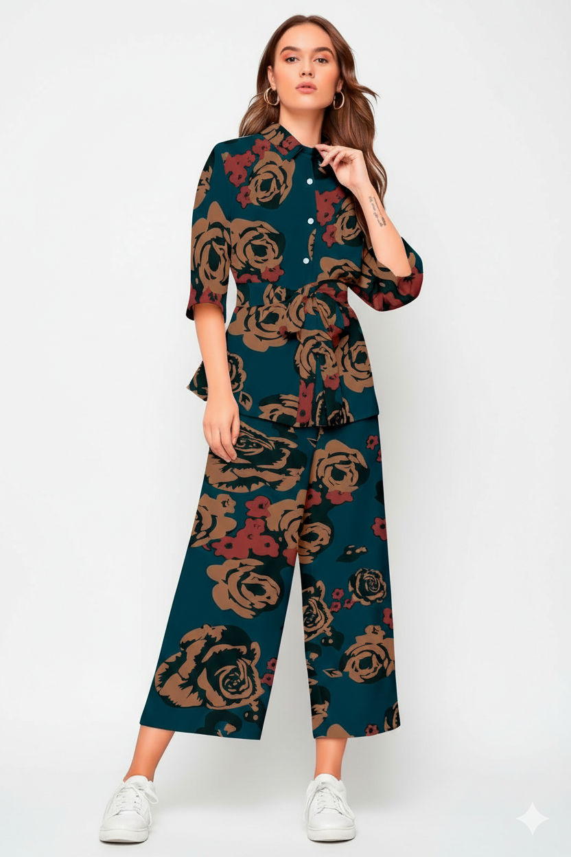 Elevate your summer wardrobe with this sophisticated co-ord set designed for effortless style. Featuring a collared shirt with delicate flower prints and quarter sleeves, paired with full-length Korean-style pants, this ensemble offers versatility for any occasion. The front button opening and waist belt create a flattering silhouette, while the soft, breathable fabric ensures comfort throughout warm days. Available in four stunning color options, this set seamlessly transitions from casual outings to semi-formal gatherings, making it an essential addition to your seasonal collection.